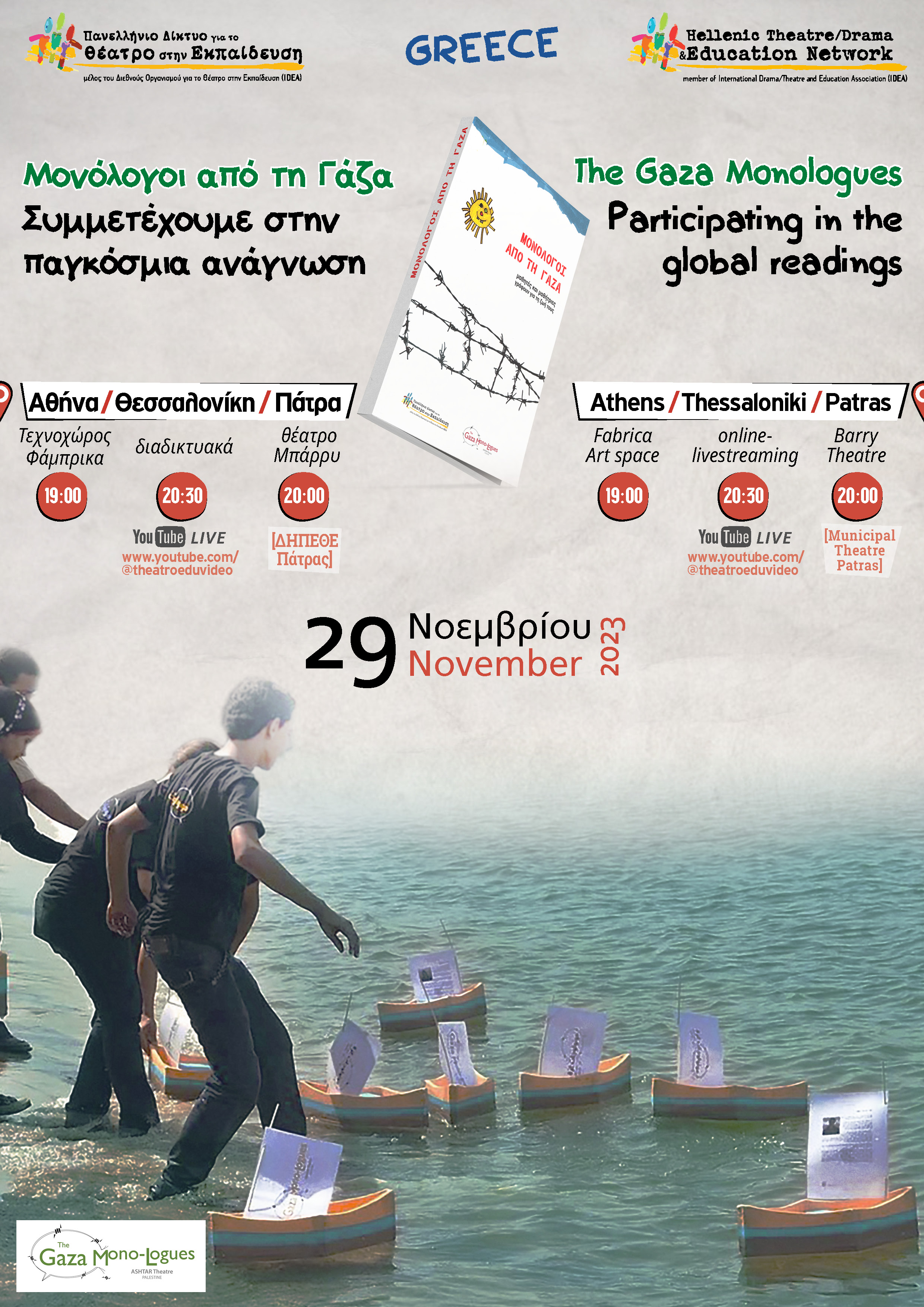 Το Πανελλήνιο Δίκτυο για το Θέατρο στην Εκπαίδευση ανταποκρινόμενο στην εξαιρετικά επείγουσα έκκληση του Παλαιστινιακού Θεατρικού Οργανισμού Ashtar Τheatre, στις 29 Νοεμβρίου 2023, Διεθνή Ημέρα Αλληλεγγύης προς τον παλαιστινιακό λαό, διοργανώνει τη δράση: